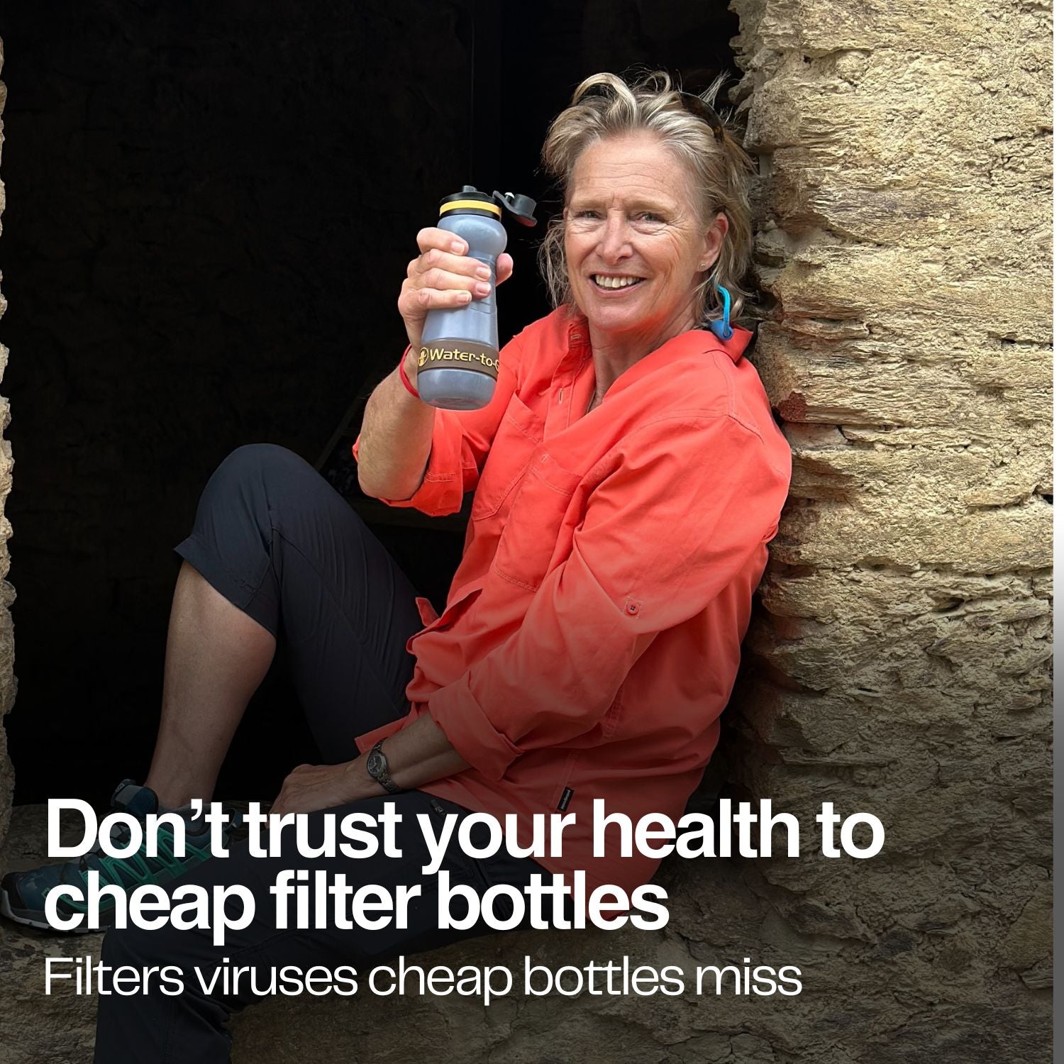 FILTER VIRUSES. Most water filter bottles provide no protection from viruses! Water-to-Go filters dangerous viruses as well as bacteria, parasites, chemicals, pesticides, heavy metals, microplastics.